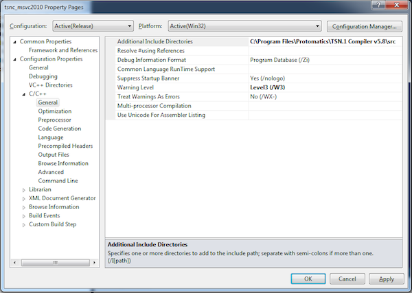 - Add the pre-built TSN.1 Compiler Runtime Library in C:\Program Files\Protomatics\TSN.1 Compiler v5.8\lib\tsnc.lib to your project as "Resource Flies".